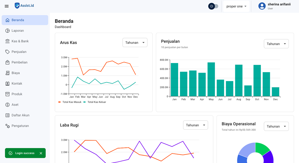 Melalui dashboard ini, pengguna dapat dengan mudah memantau performa keuangan tanpa perlu melihat laporan secara detail satu per satu. Informasi yang ditampilkan bersifat real-time dan membantu dalam pengambilan keputusan yang lebih cepat dan tepat.
