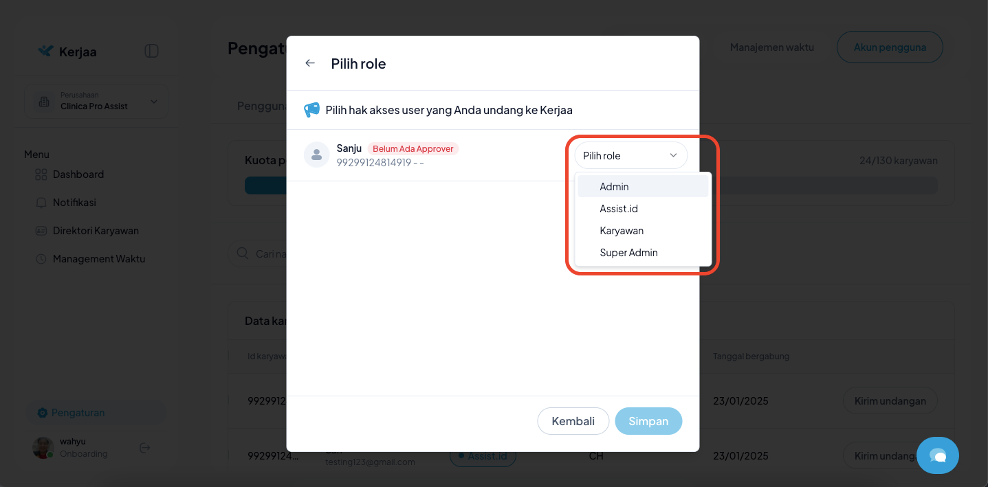 - Pilih Role (Peran) yang sesuai dengan kebutuhan karyawan tersebut.