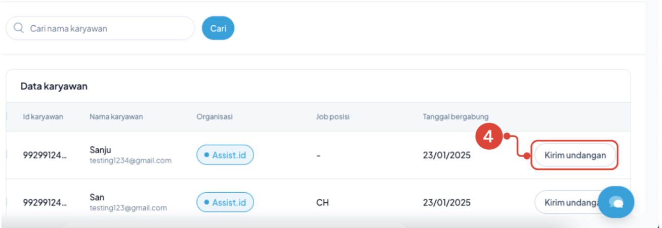 - Disini, terdapat Data Karyawan yang belum mendapatkan akses ke Aplikasi Kerjaa.id. Klik pada opsi Kirim Undangan untuk mengirimkan undangan akses ke Karyawan yang dituju.