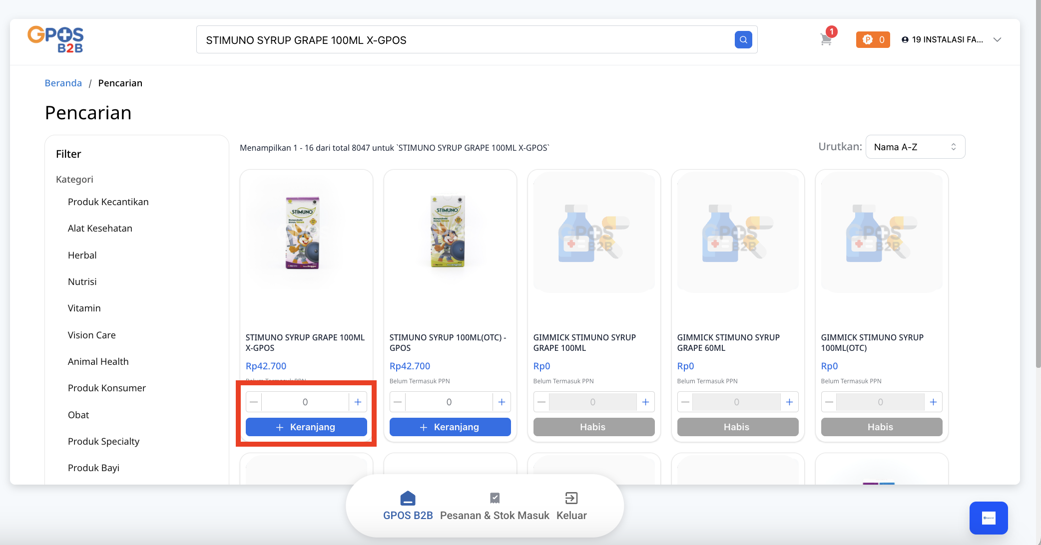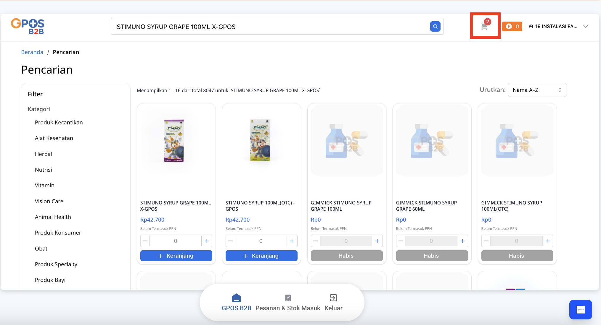 - Pada halaman ini, Anda dapat mencari obat dengan mengetikkan nama obat pada kolom Cari di GPOS B2B, atau memilih obat berdasarkan kategori maupun produk yang tersedia.