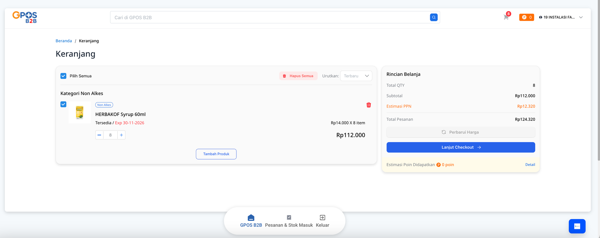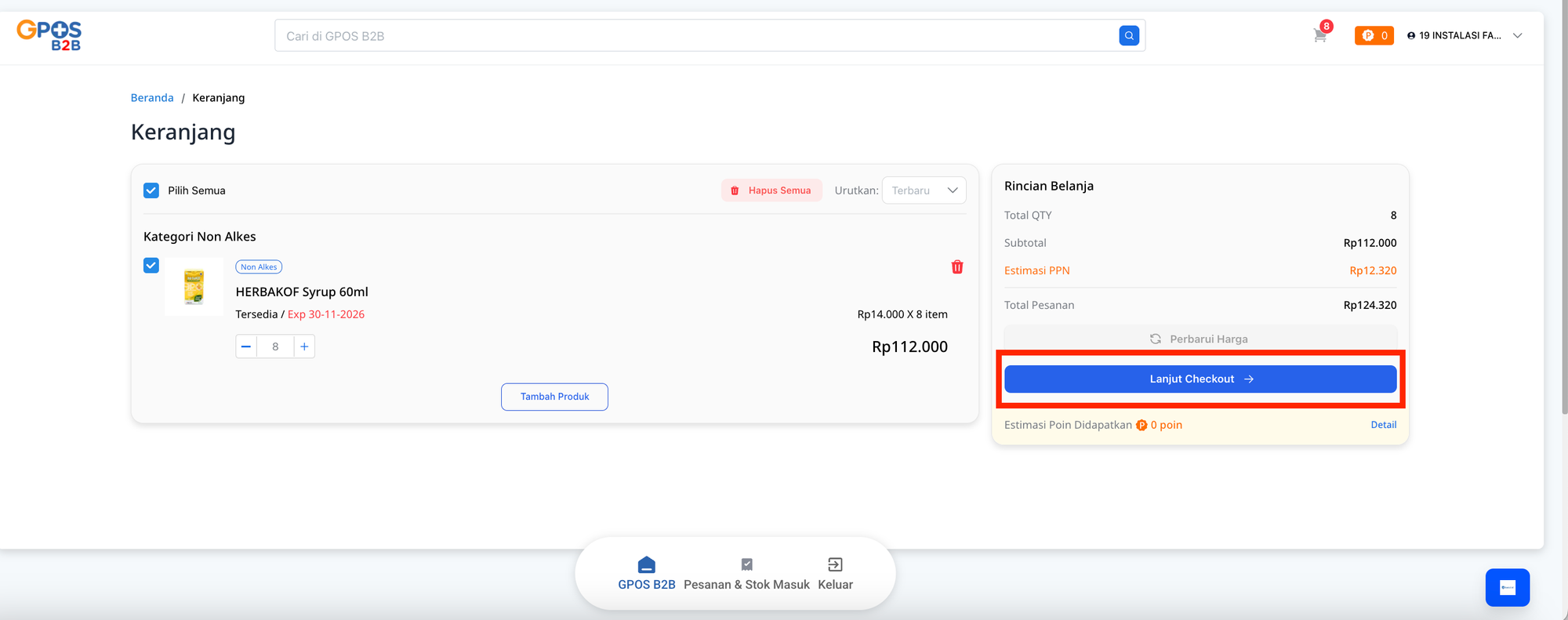 - Klik tombol Lanjut Checkout. Sistem akan menampilkan konfirmasi apabila terdapat produk dengan masa kedaluwarsa kurang dari 1 tahun. Anda dapat memilih Batal atau Lanjutkan sesuai kebutuhan.