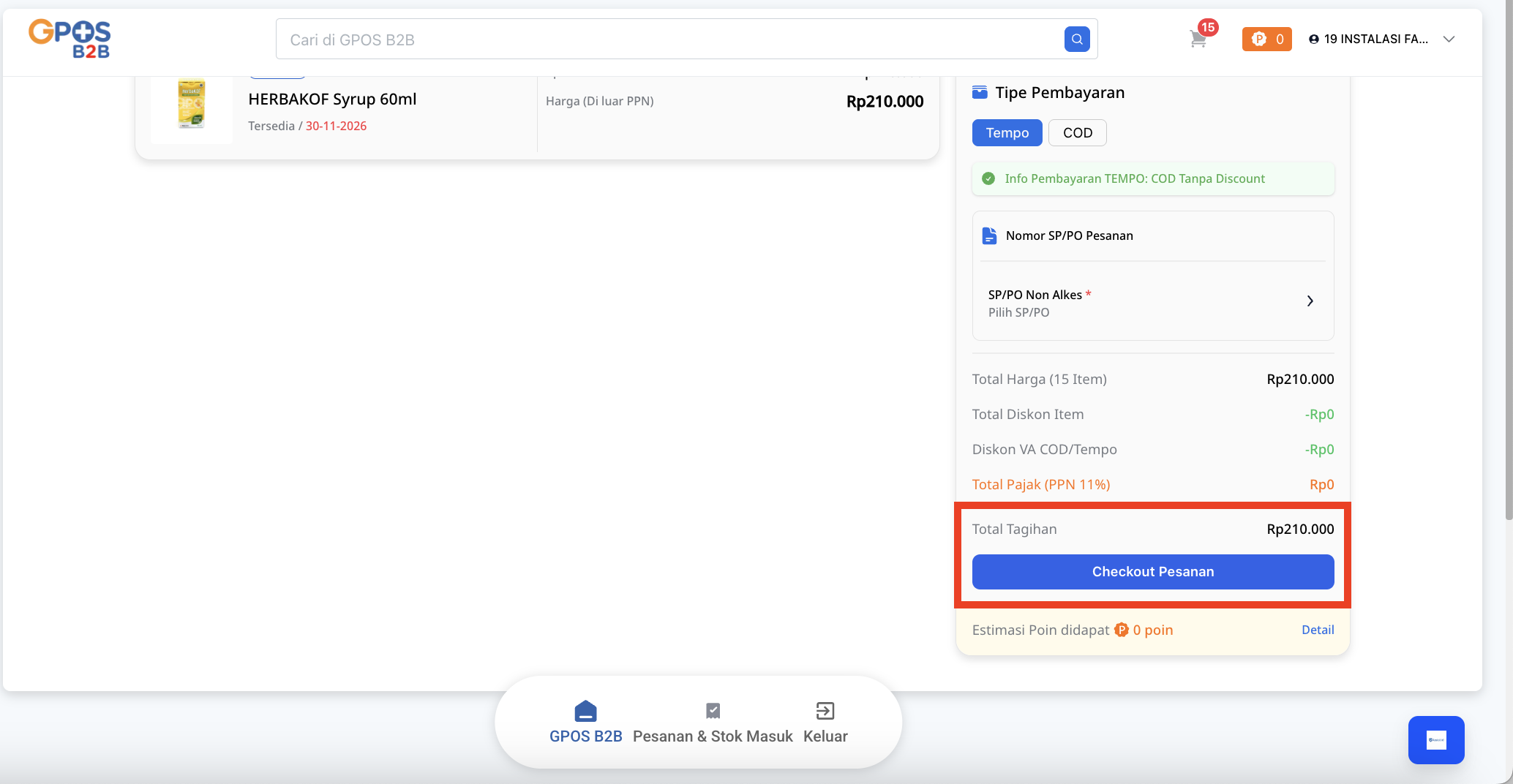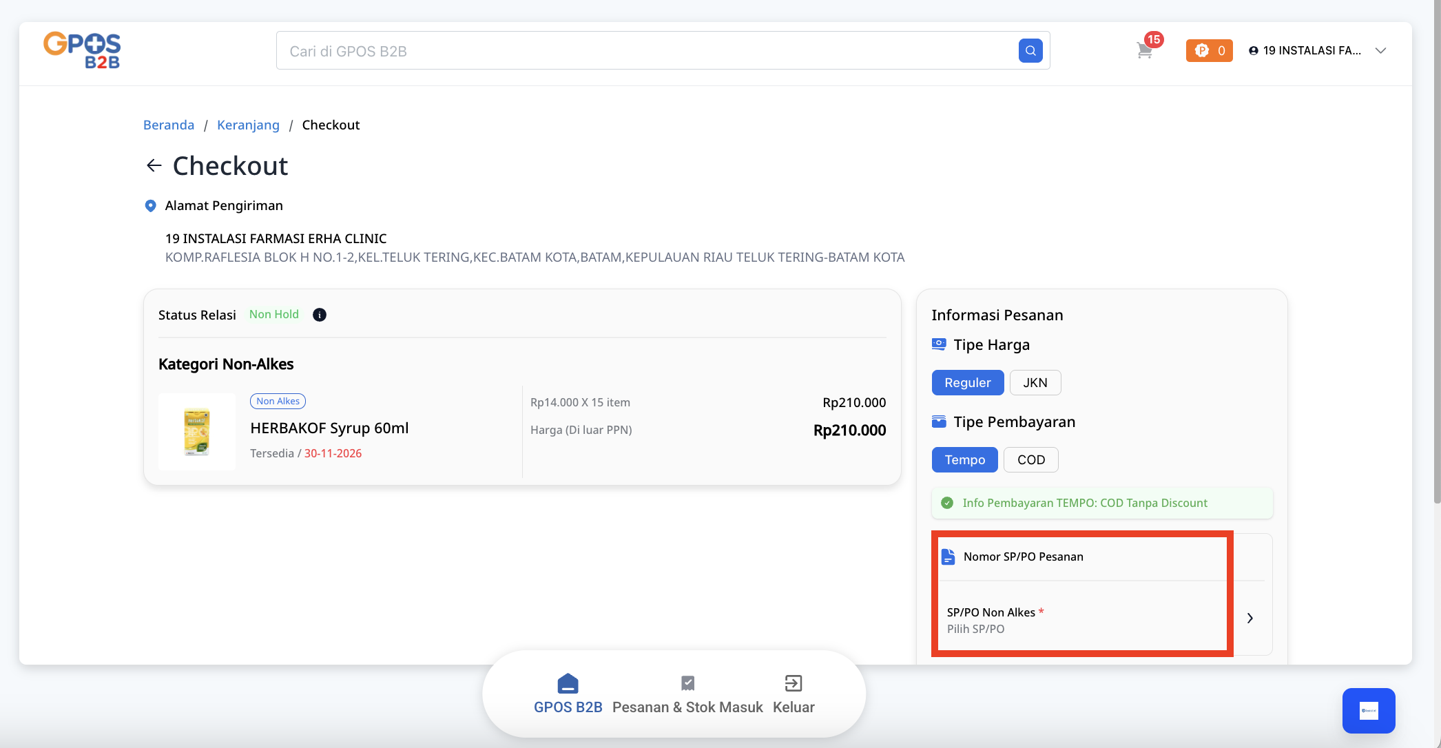 - Pada halaman Checkout, pastikan kembali pesanan sudah sesuai. Untuk pembelian obat tertentu seperti obat prekursor (obat yang tidak dijual bebas), Anda perlu mengisi Nomor SP/PO di bagian Informasi Pesanan yang ada di sebelah kanan.