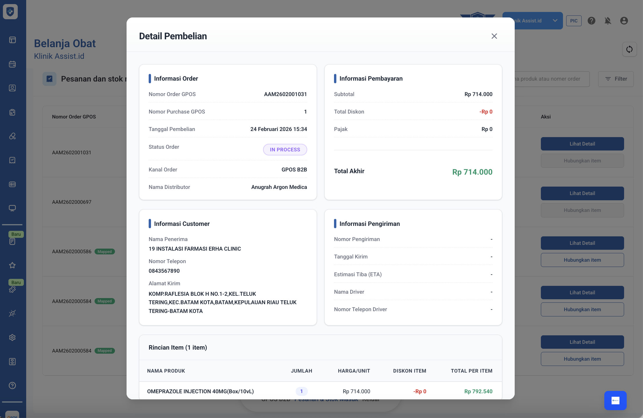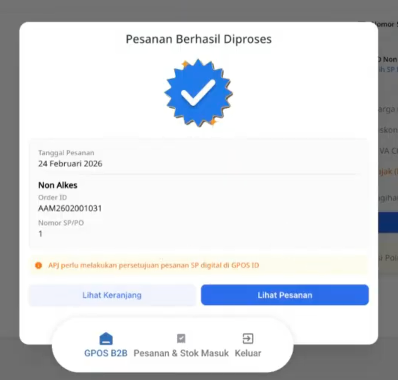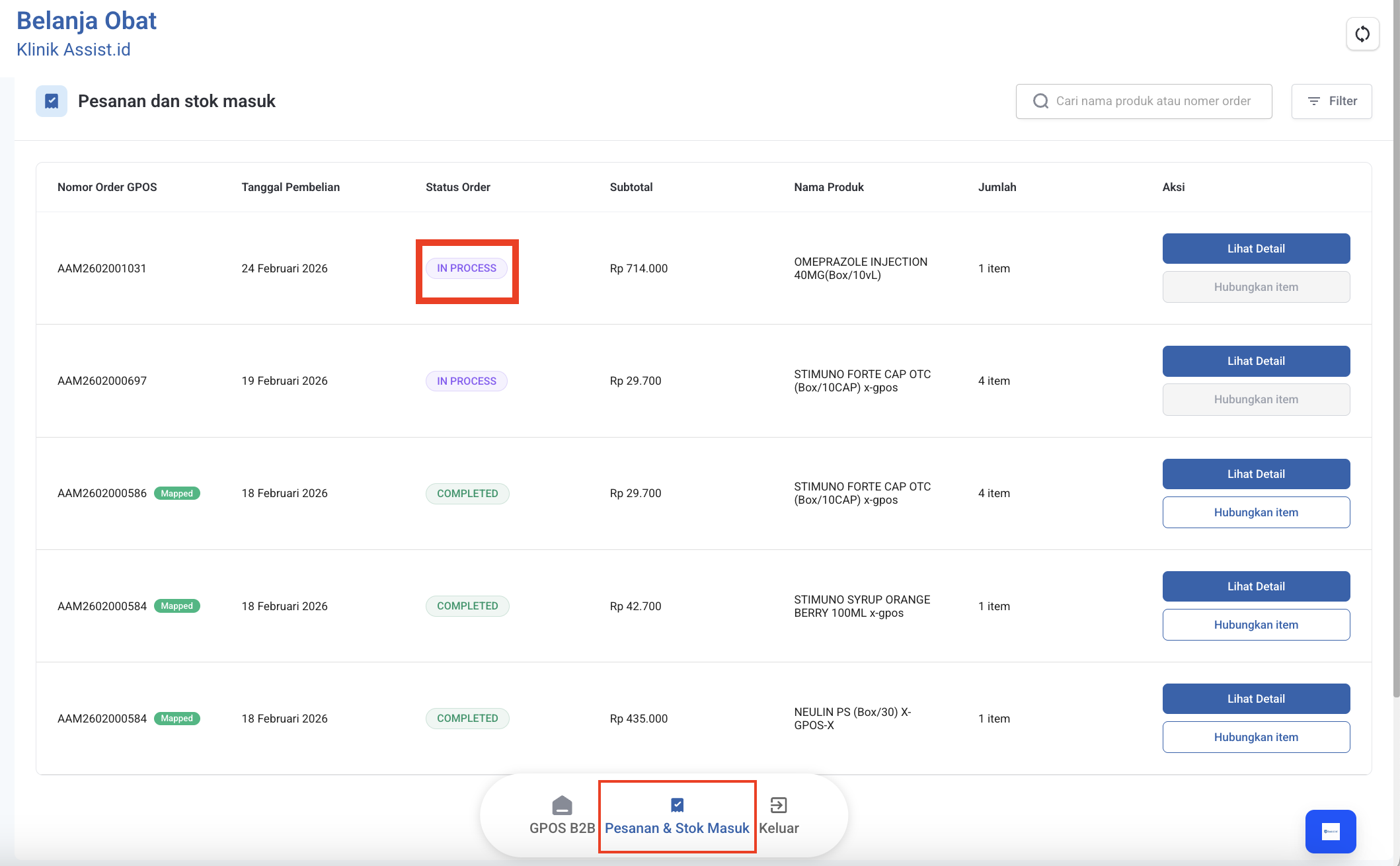 - Pesanan yang berhasil dibuat akan otomatis masuk ke sistem GPOS dengan status In Process. Anda dapat memantau proses pembelian obat melalui menu Pesanan & Stock Masuk.