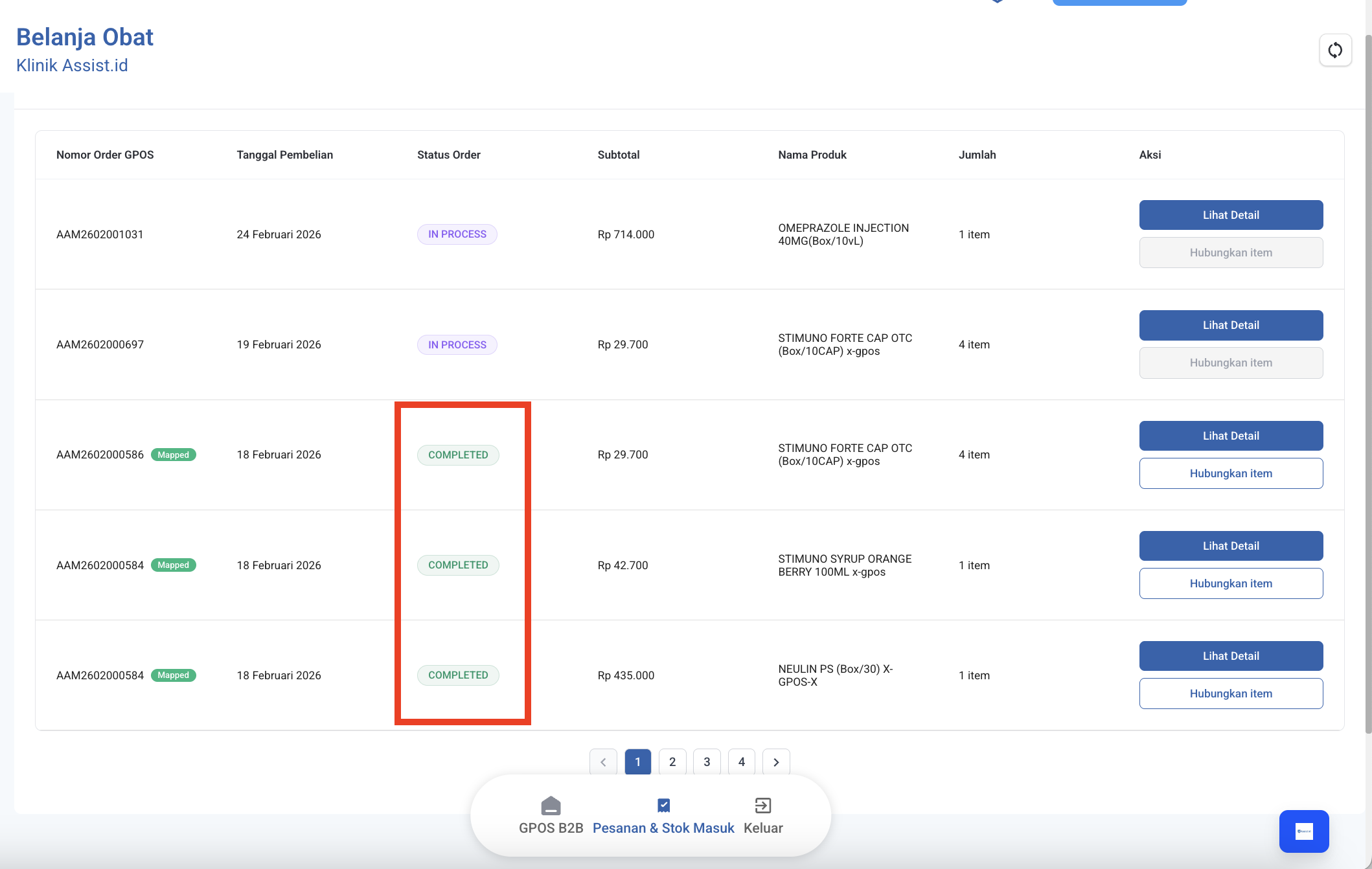 Jika status pesanan sudah Completed, artinya proses pengiriman obat telah selesai dan pesanan sudah diterima oleh faskes.