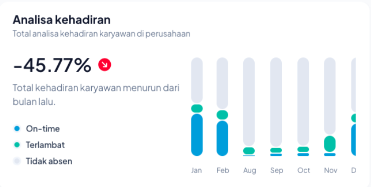 - 🔵 On-time: Jumlah karyawan yang melakukan absensi tepat waktu sesuai jadwal.