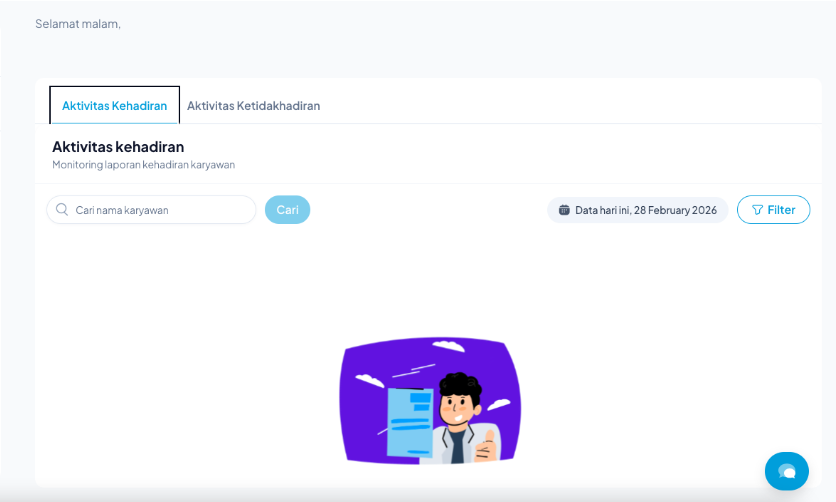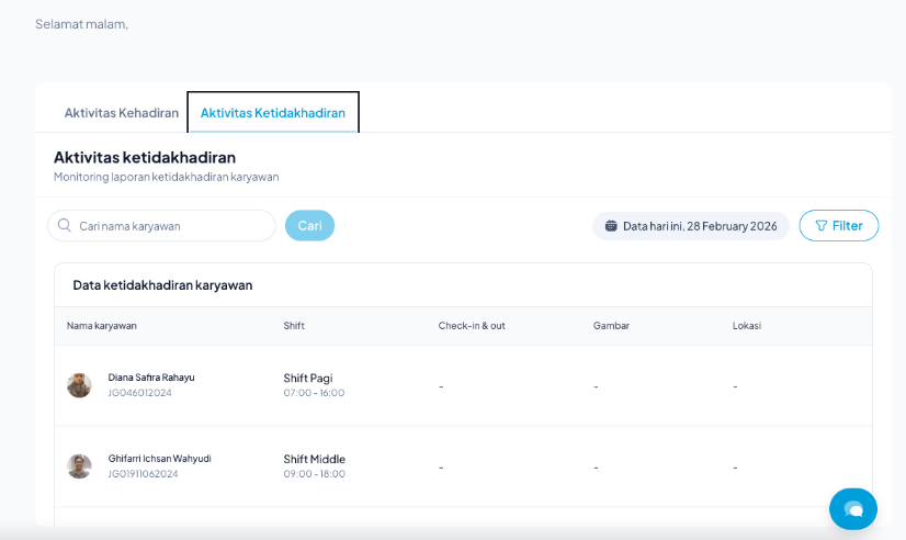- Aktivitas Kehadiran: Menampilkan daftar karyawan yang sudah melakukan absensi (beserta waktu dan lokasinya).