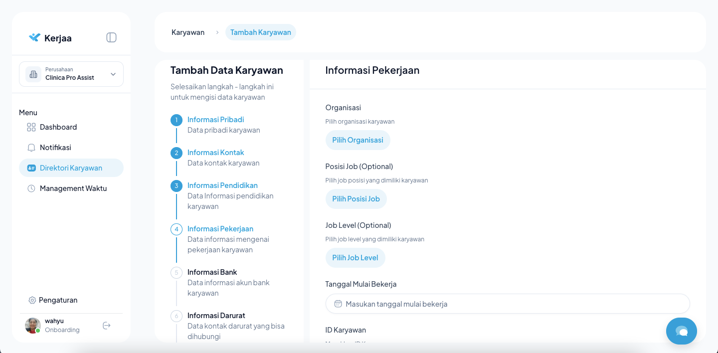 - Wajib: Organisasi, Tanggal Mulai Bekerja, dan ID Karyawan.