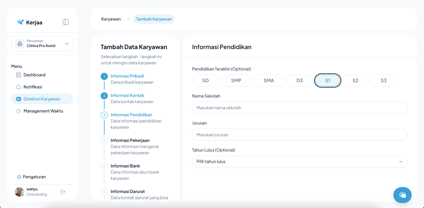 - Kemudian bisa mengisi Informasi Pendidikan sesuai dengan Riwayat Pendidikan Karyawan. Data ini bersifat Opsional. Apabila sudah diisikan, klik Selanjutnya.