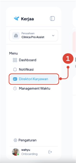 - Masuk ke menu Direktori Karyawan untuk mengakses fitur Penambahan data Karyawan;