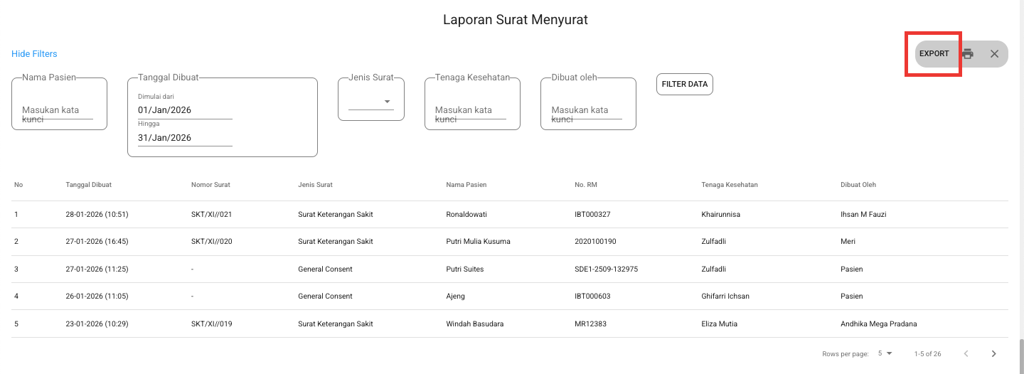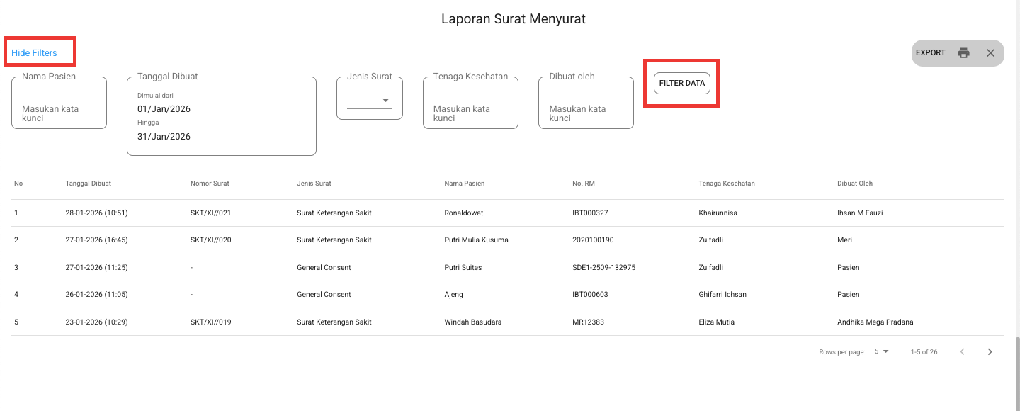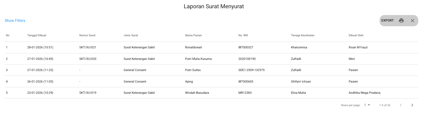 Note: Fitur ini hanya menampilkan surat yang dibuat di modul Registrasi dan modul EMR.
