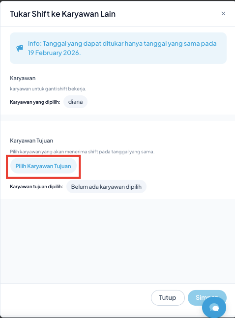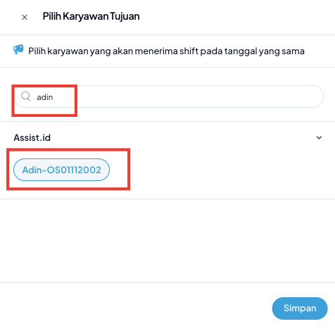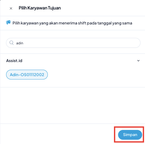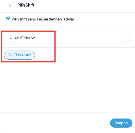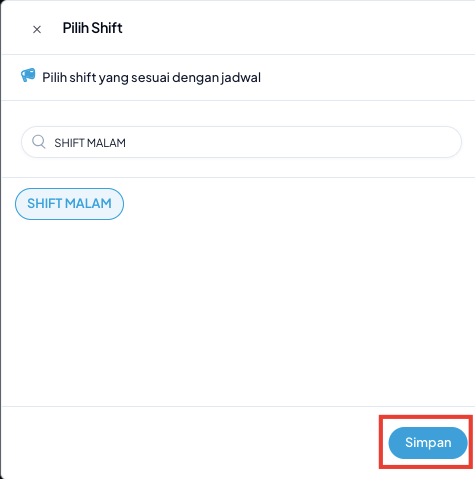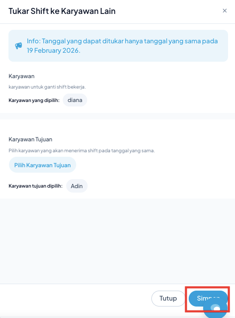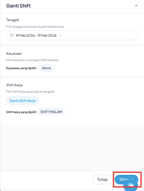 Pastikan data karyawan dan tanggal shift sudah benar sebelum menekan tombol Simpan.