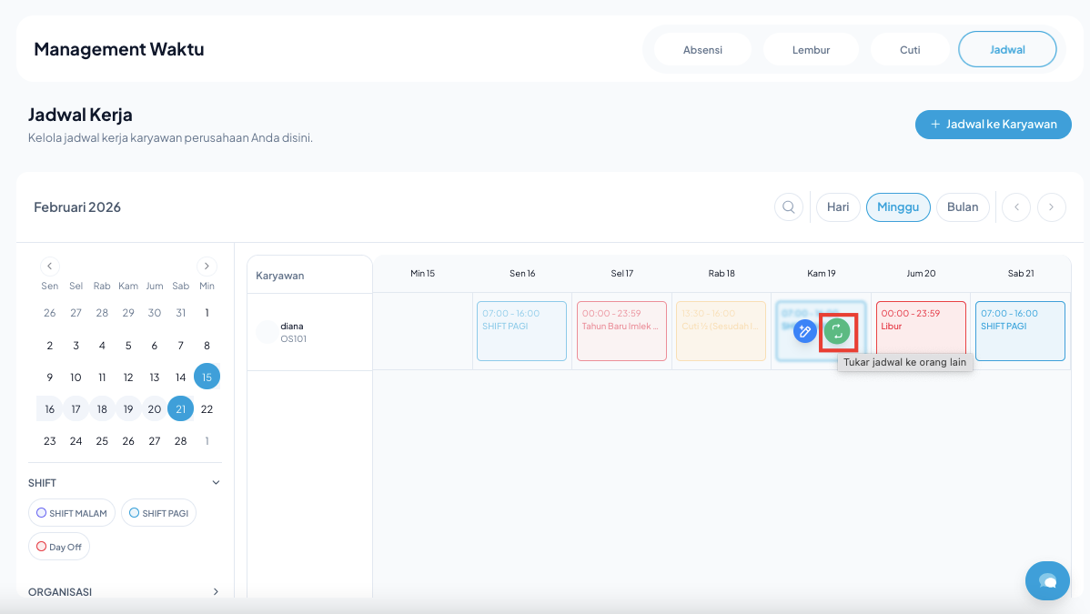 - Melakukan switch (tukar) jadwal shift antar karyawan.