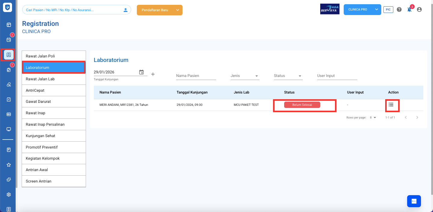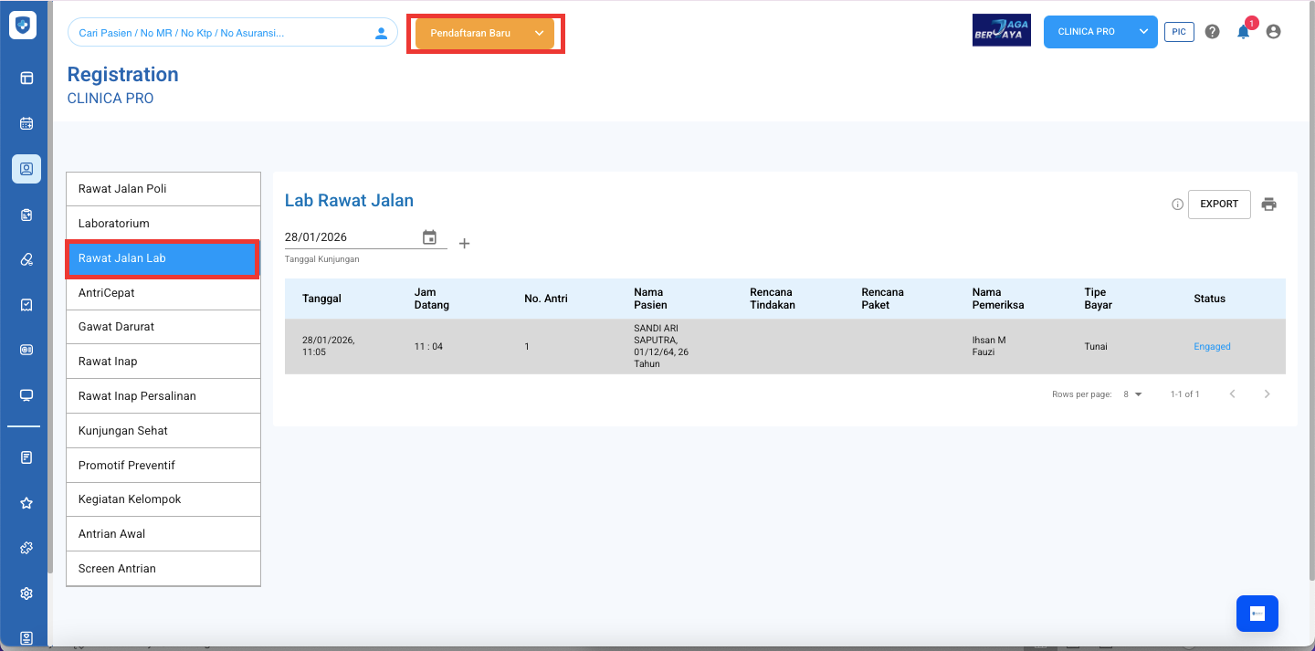 - Lalu ke Menu Rawat Jalan Lab dan klik Pendaftaran Baru