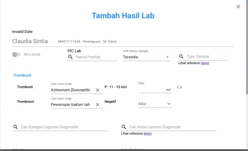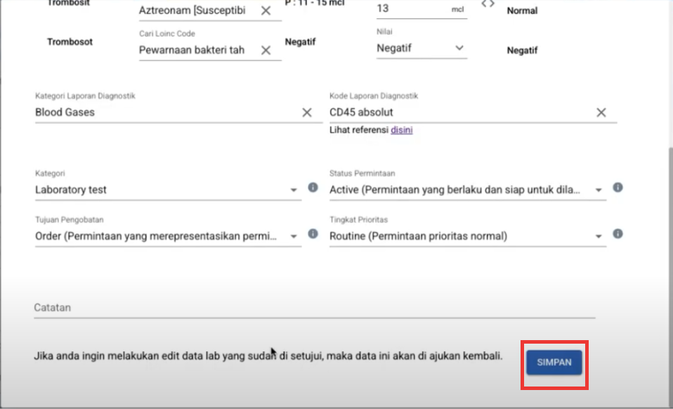 - Setelah Menambah data order di menu Registrasi > isi hasil Lab di modul Registrasi > Laboratorium