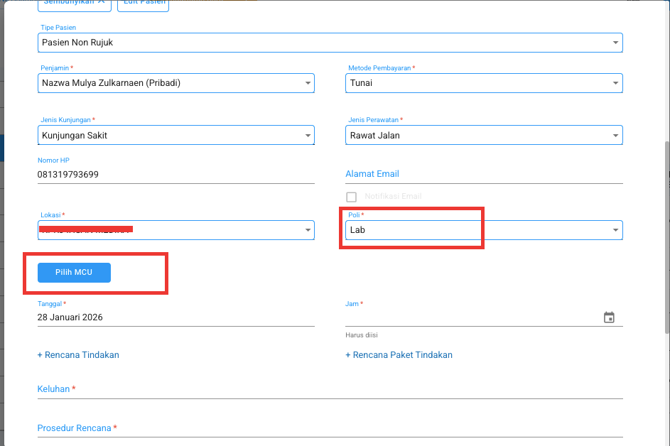 - Isi data kunjungan pasiennya dan pilih Poli Lab lalu klik Pilih MCU