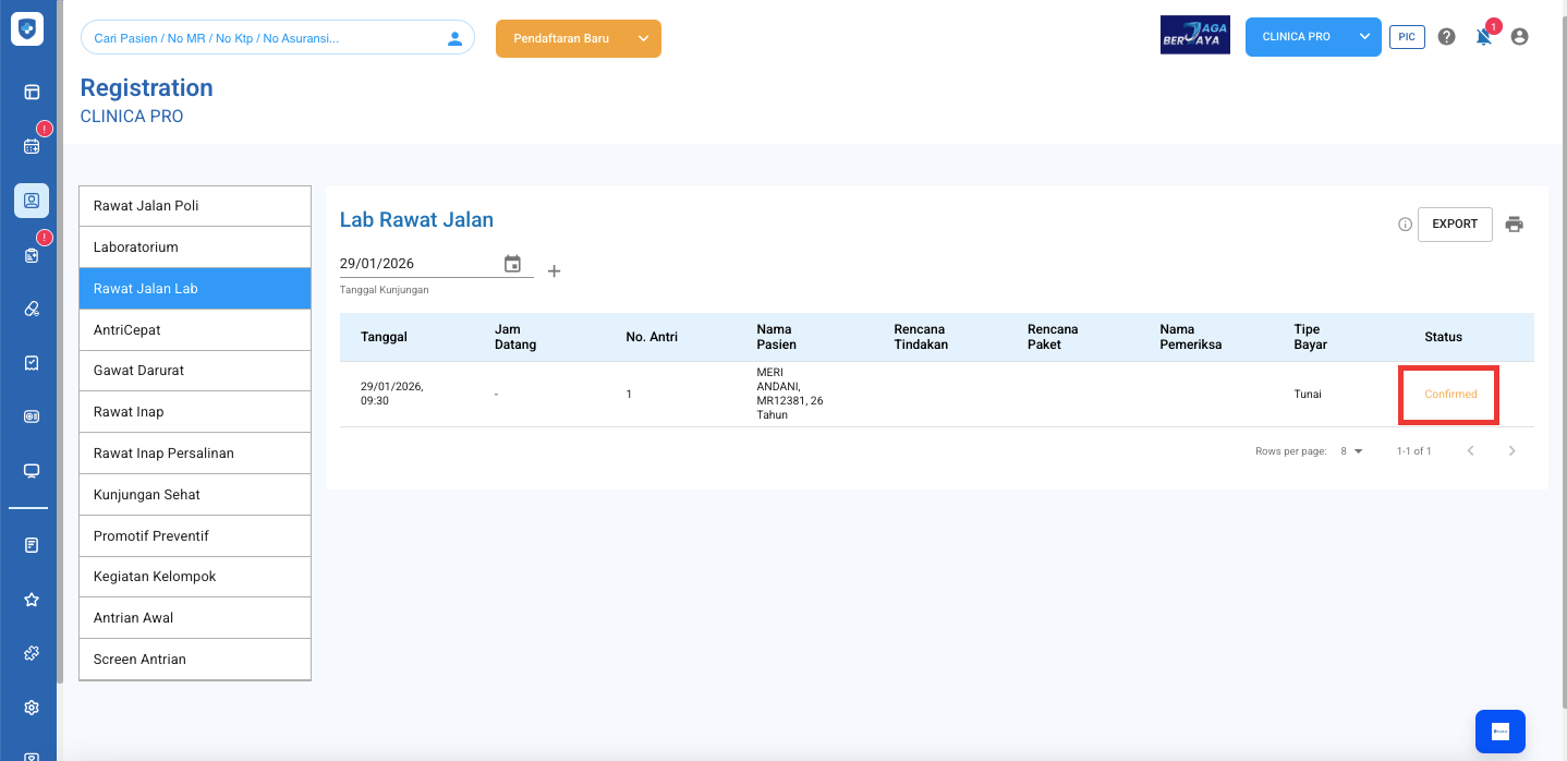 - Selanjutnya masuk ke menu Registrasi, lalu pilih Sub Menu Rawat Jalan Lab dan ubah status pasiennya dari Confirmed ke Waiting sampai Engage dan silakan pilih Tenaga medisnya.