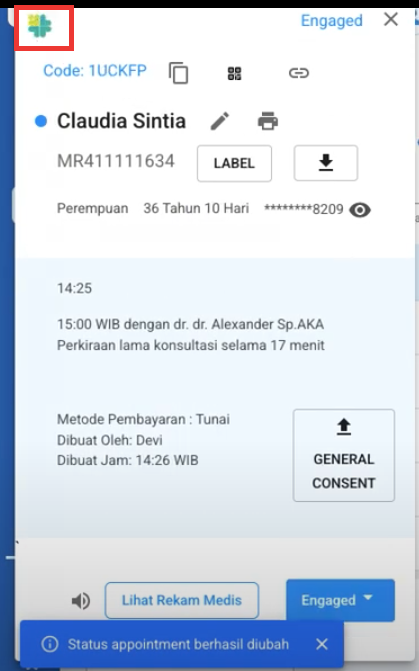 - Jika statusnya sudah diubah ke Engaged, maka akan muncul Logo Satu Sehat di kunjungan pasiennya seperti pada gambar.
