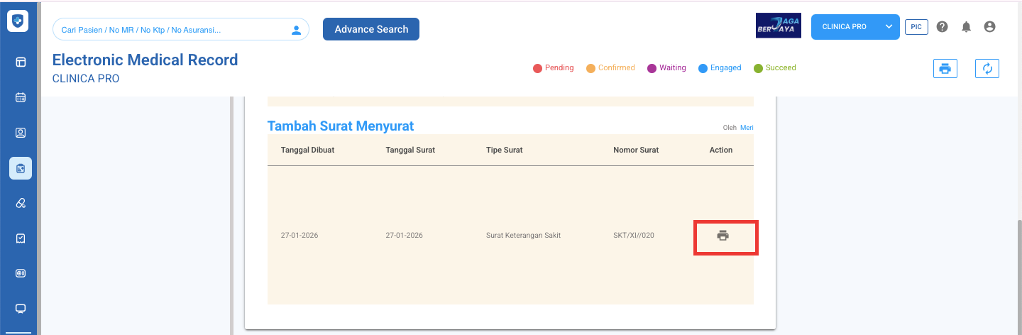 1. Pastikan surat sudah dibuat pada EMR pasien (Cek Cara Membuat Surat Menyurat disini) Jika surat sudah di tambahkan ke EMR pasien, klik logo print di bagian surat di EMR pasiennya