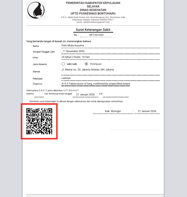 Halo Rekan-rekan Assist.id! Fitur Cek Keaslian Surat via QR Code digunakan untuk memastikan bahwa surat yang diterbitkan oleh fasilitas kesehatan adalah asli dan terverifikasi melalui sistem.