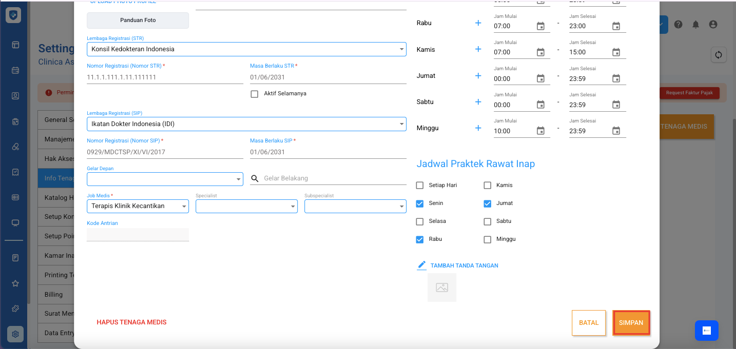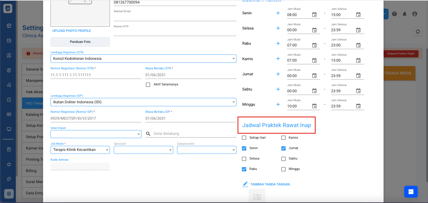 - Atur atau sesuaikan Jadwal Praktek Rawat Inap 24 Jam sesuai kebutuhan.