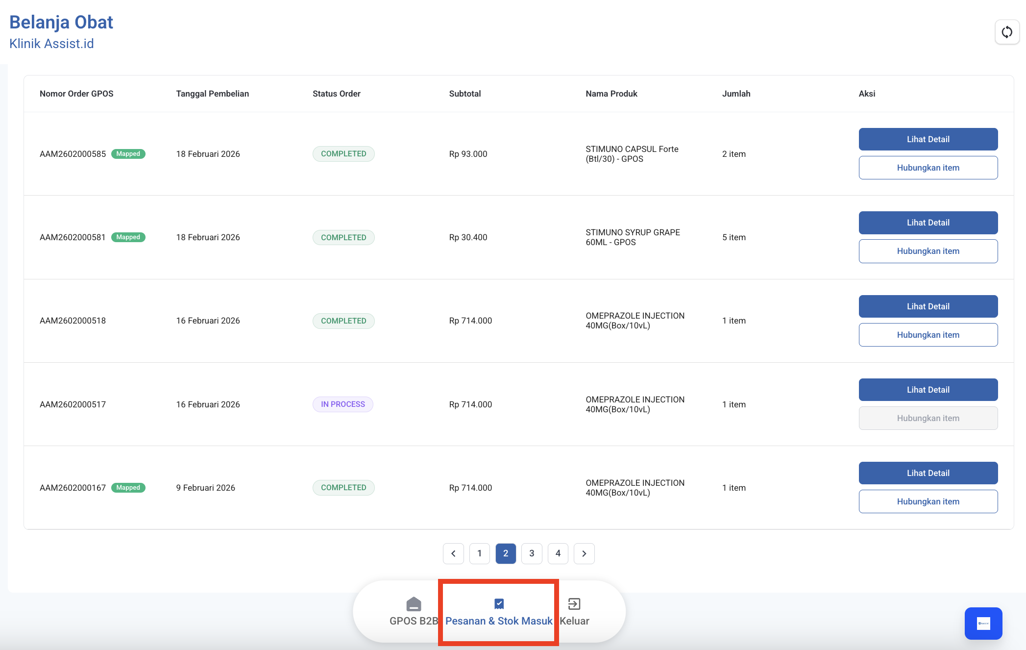 - Setelah login ke sistem, klik menu Belanja Obat lalu buka menu Pesanan & Stok Masuk untuk melihat daftar obat yang sudah dibeli melalui Belanja Obat.