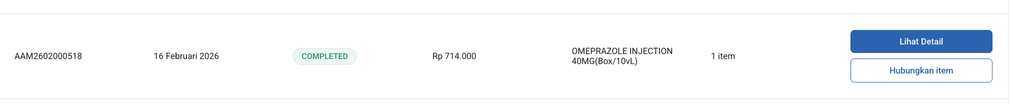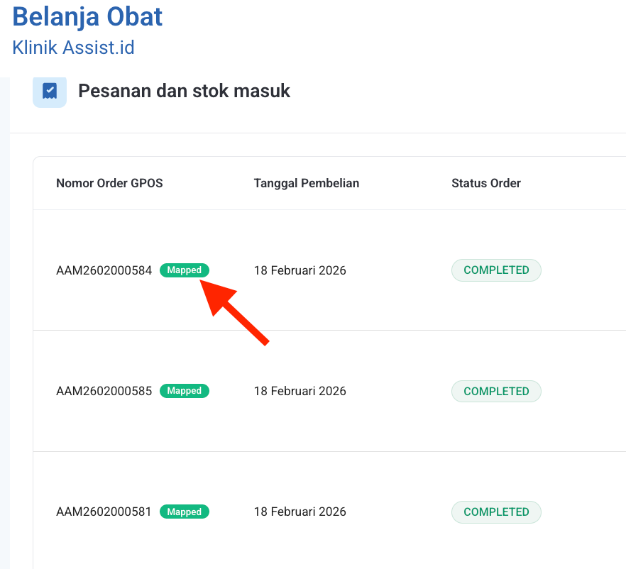 - Temukan data obat yang statusnya Completed. Status ini menandakan pesanan sudah selesai dan siap untuk diproses ke stok apotek.