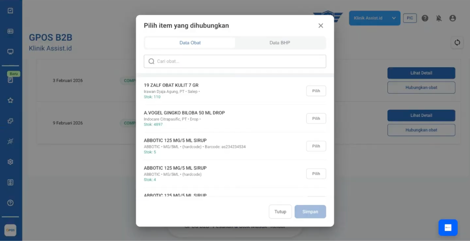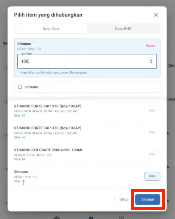 - Klik tombol Hubungkan Item pada obat yang ingin dimasukkan ke stok apotek.