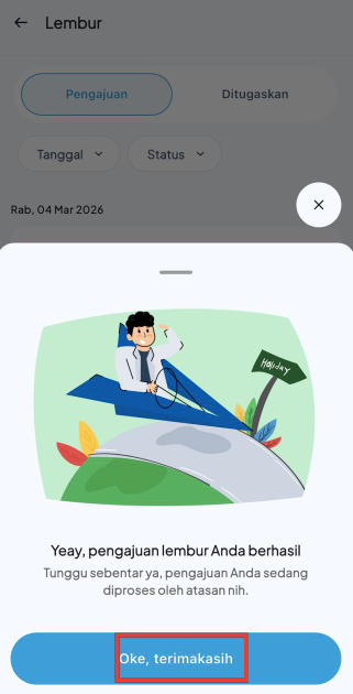 - Saat semua data sudah diinputkan maka pengajuan lembur berhasil disimpan, klik Oke, terimakasih