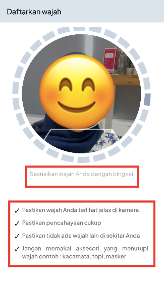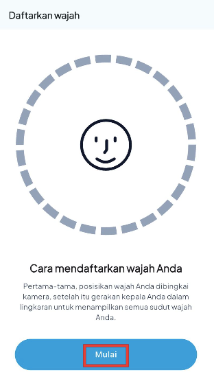- Lalu muncul halaman Daftarkan Wajah, pastikan anda mengikuti petunjuk cara mendaftarakan wajah dengan benar dan klik Mulai.