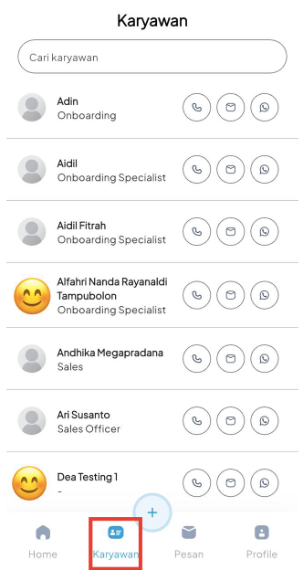 Digunakan untuk menampilkan detail profil karyawan lain secara lengkap, seperti divisi, nomor handphone, email, dan nomor WhatsApp.