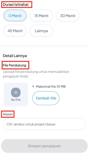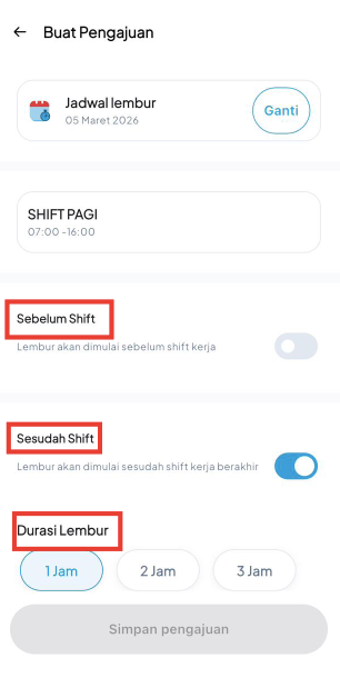 - Lalu isi data seperti Sebelum Shift/Sesudah Shift, Durasi Lembur
