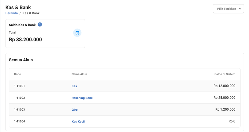 - Semua Akun Menampilkan detail setiap akun Kas dan Setara Kas, meliputi: