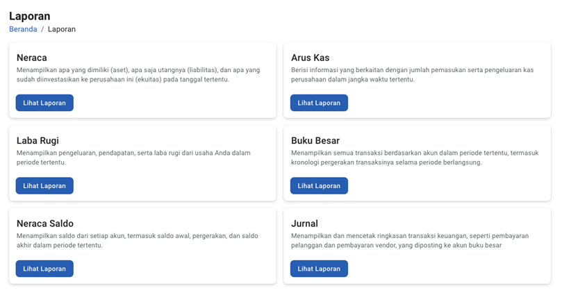 Laporan keuangan merupakan bagian penting dalam sistem akuntansi karena membantu faskes memantau seluruh aktivitas keuangan secara menyeluruh. Melalui menu Laporan, pengguna dapat melihat berbagai jenis laporan keuangan yang telah disediakan oleh Cashbook sesuai periode yang diinginkan.