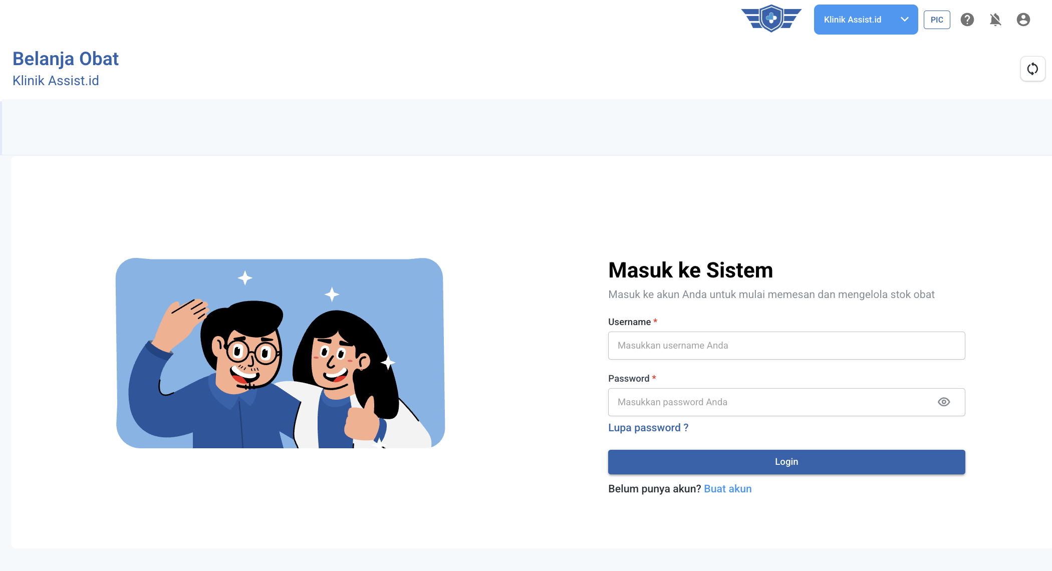 - Setelah berhasil login, Anda akan diarahkan ke halaman Dashboard Belanja Obat. Pada halaman tersebut, Anda sudah dapat langsung melakukan pembelian obat melalui sistem Assist.id.