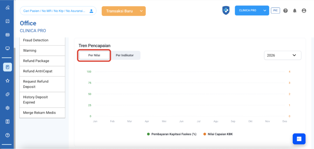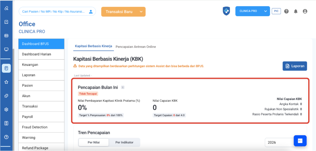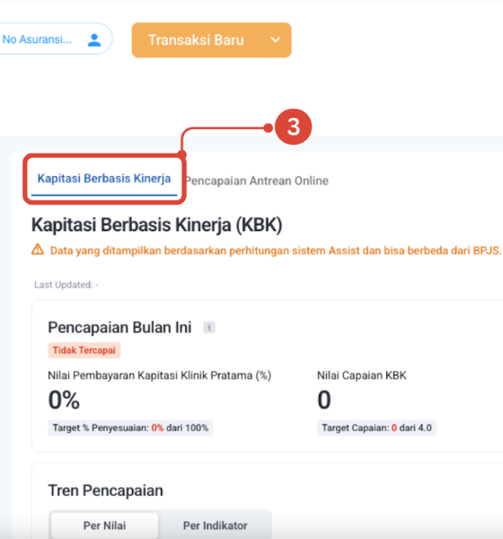 Bagian ini memberikan gambaran ringkas mengenai performa fasilitas kesehatan pada bulan berjalan. Ini adalah indikator pertama yang perlu Anda cek untuk melihat apakah target bulan ini sudah terpenuhi ataupun belum terpenuhi.