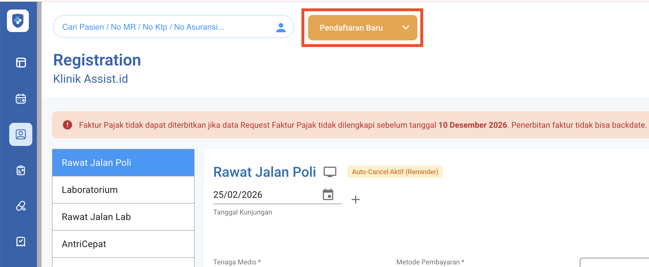 - Klik Pendaftaran Baru pada menu Registration atau Rawat Jalan