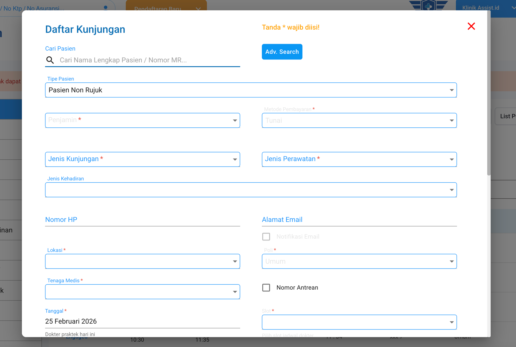 - Lalu isi dan lengkapi form Kunjungan Baru seperti ketika mendaftarkan pasien seperti biasa