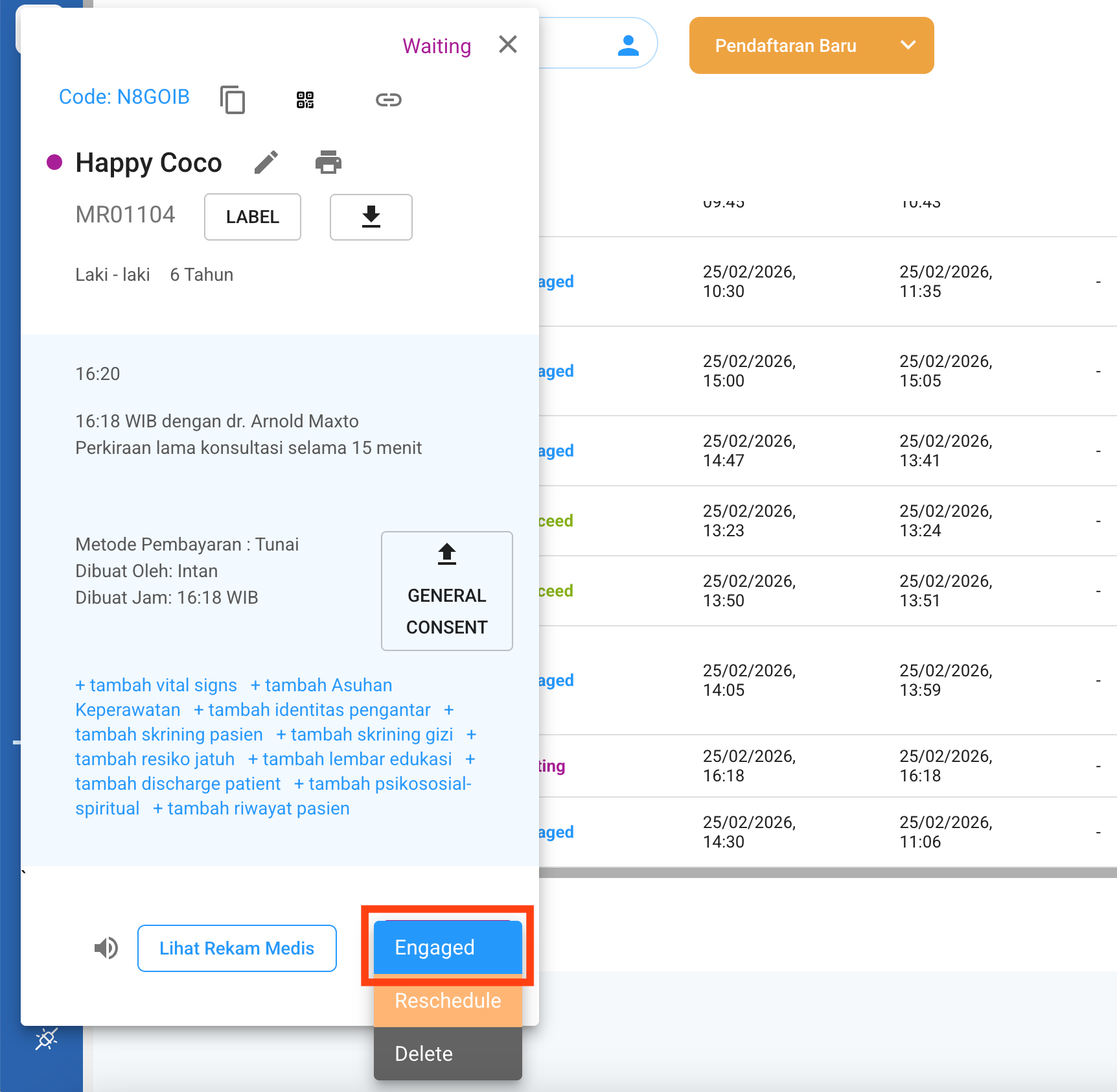 - Lalu klik nama pasien dan ubah status dari Confirmed menjadi Engage.