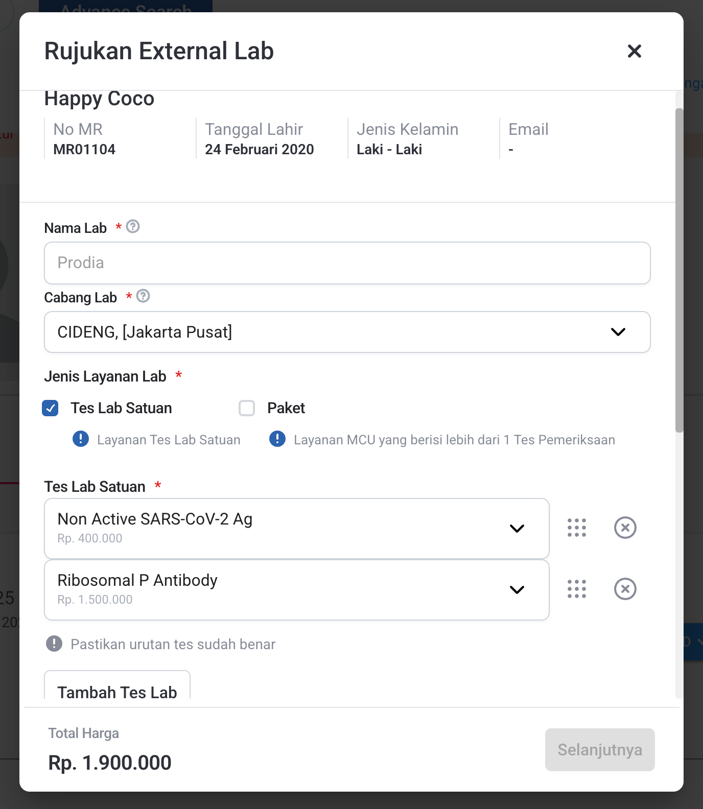 - Jenis Layanan Lab, Anda bisa memilih Tes Lab Satuan atau Paket, Anda bisa menambahkan lebih dari satu Satuan jenis Lab maupun Paket.