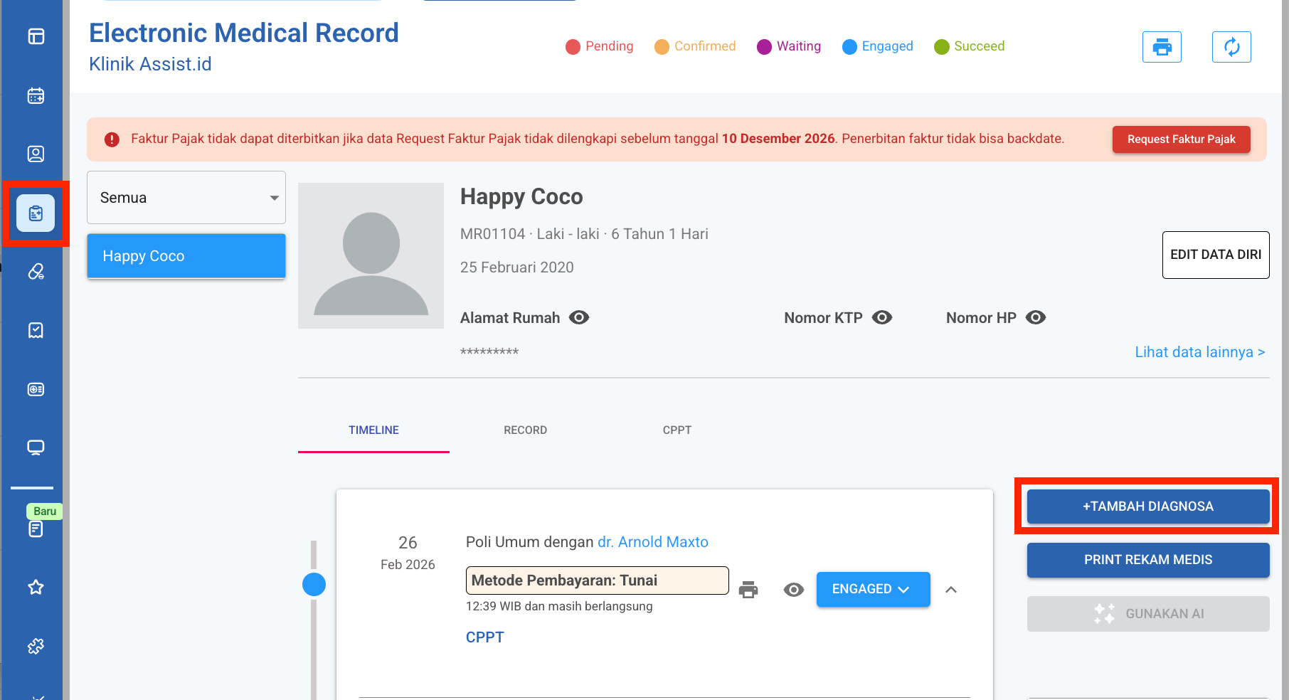 - Pada menu EMR, faskes bisa mengisi catatan rekam medis pasien dengan cara klik Tambah Diagnosa