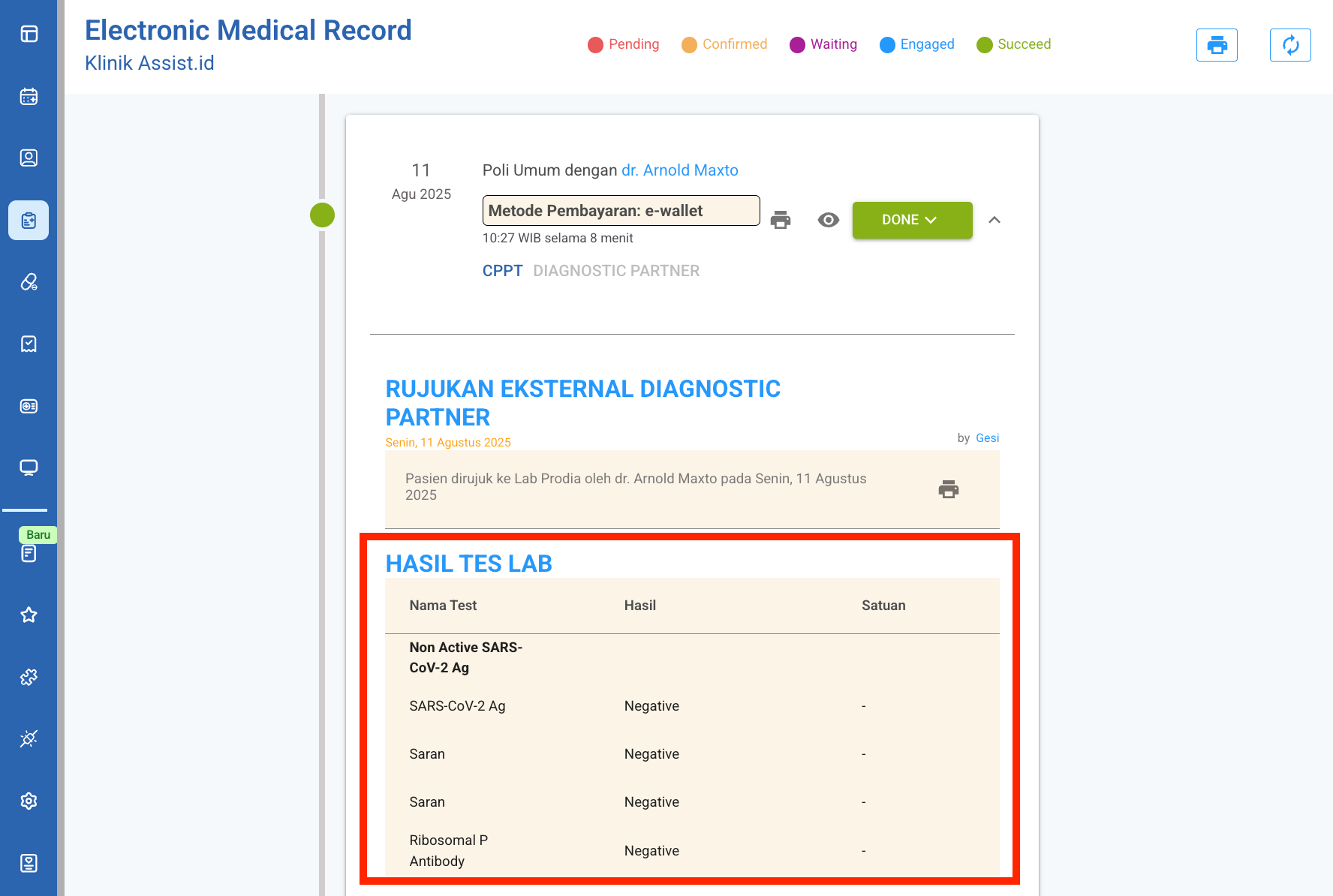 - Anda bisa melihat Hasil Lab Pasien di dalam EMR pasien di sistem Assist.id setelah Lab Partner menginputkan hasilnya