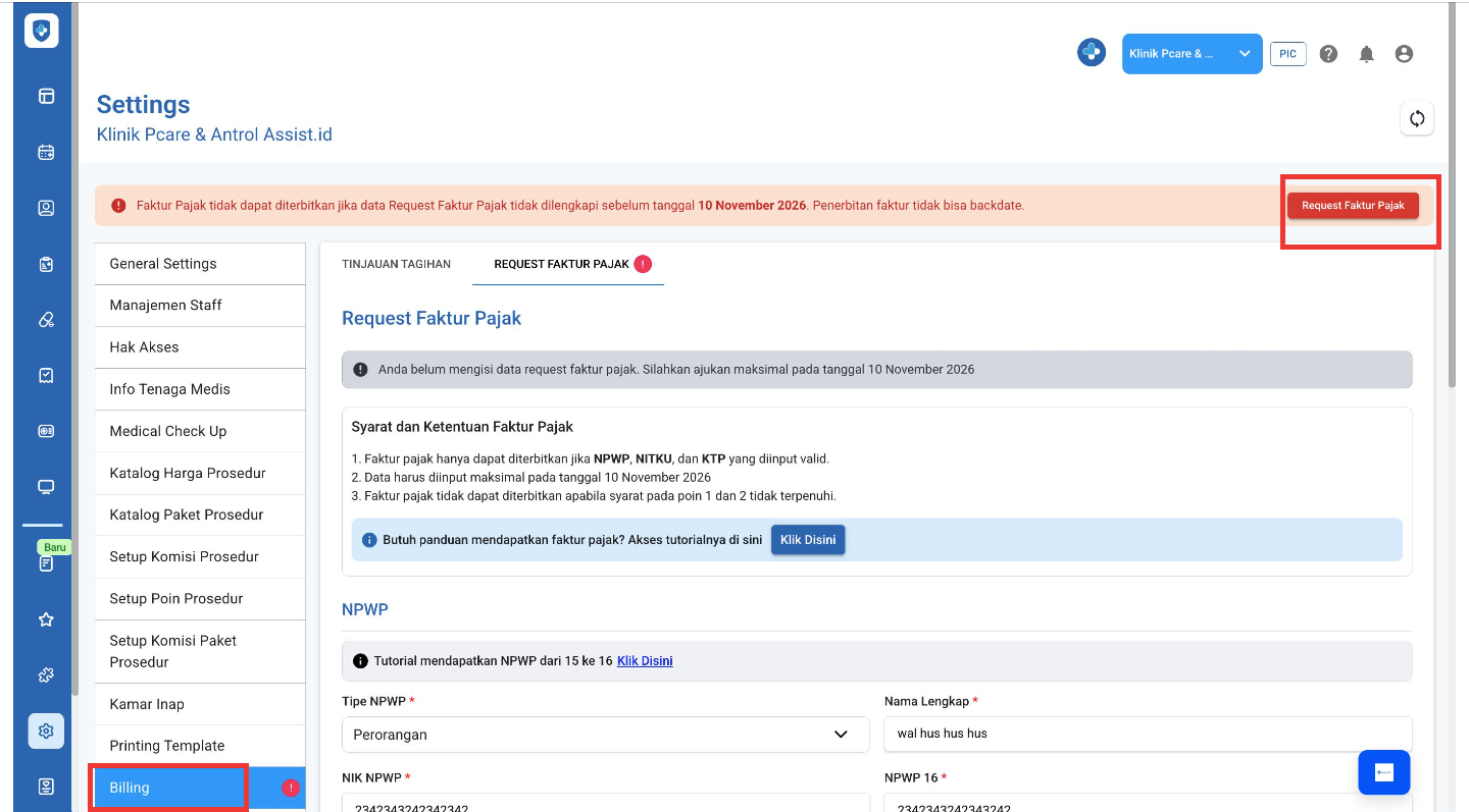 Pengajuan (request) Faktur Pajak kini dibatasi hingga tanggal 10 bulan berikutnya setelah billing dibuat. Sistem akan otomatis menutup akses permintaan faktur pajak untuk billing yang telah melewati batas waktu tersebut.