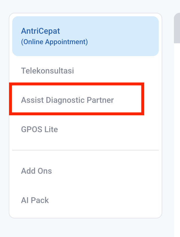Assist Diagnostic Partner adalah layanan yang tersedia di Assist.id yang memungkinkan klinik melakukan rujukan pasien ke laboratorium secara terintegrasi langsung melalui sistem. Dengan fitur ini, klinik dapat membuat rujukan pasien secara lebih terstruktur, memberikan pengalaman layanan yang lebih profesional kepada pasien, serta memperoleh nilai tambah dari proses rujukan yang sebelumnya masih dilakukan secara manual.