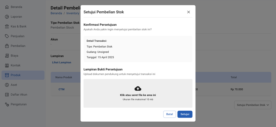 Setiap pembelian yang dicatat akan menambah jumlah stok produk setelah proses persetujuan selesai dilakukan. Dengan demikian, stok yang masuk ke sistem akan tercatat secara akurat dan langsung terhubung dengan pencatatan keuangan, sehingga memudahkan pengelolaan persediaan serta monitoring nilai pembelian secara keseluruhan.