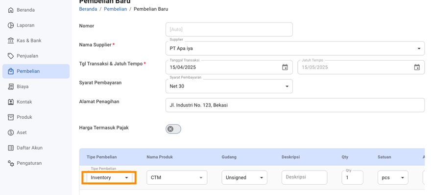 - Isi informasi pembelian dengan memilih tipe Inventory