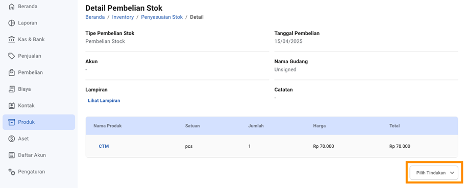 - Masuk ke menu Produk, lalu pilih transaksi pembelian yang baru dibuat dengan klik Lihat Detail