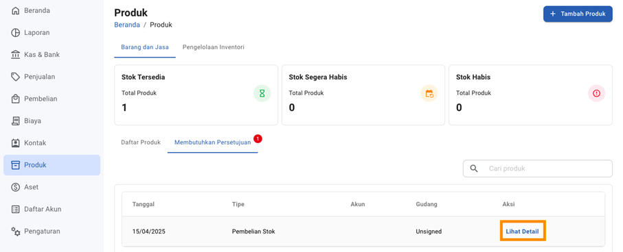 Stok ini akan masuk ke bagian Membutuhkan Persetujuan, sehingga pengguna perlu melakukan konfirmasi terlebih dahulu agar stok dapat digunakan.