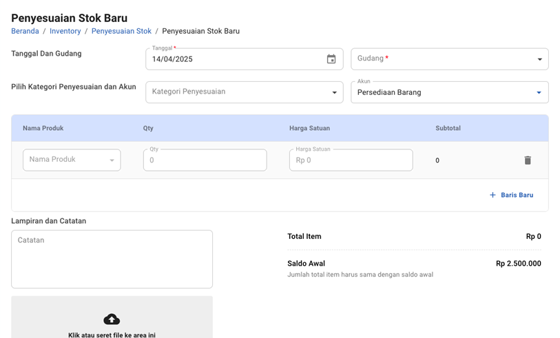 - Pada halaman Penyesuaian Stok, tambahkan produk dan isi detail yang diperlukan