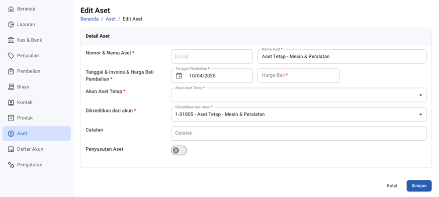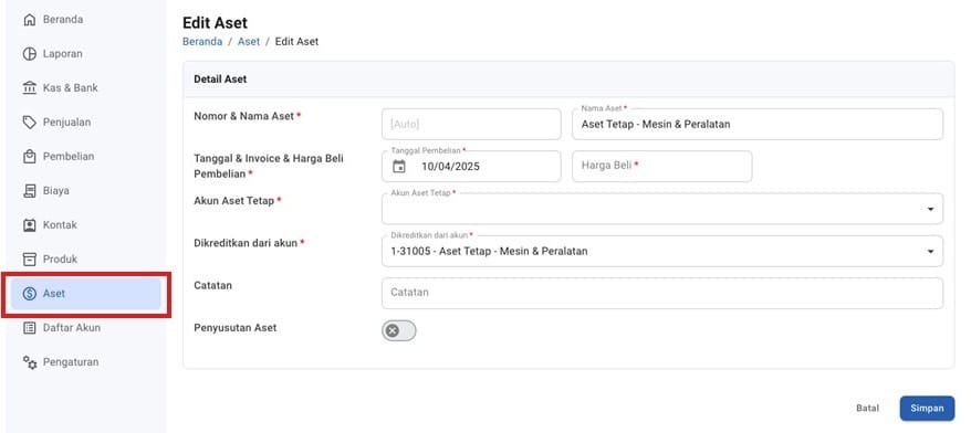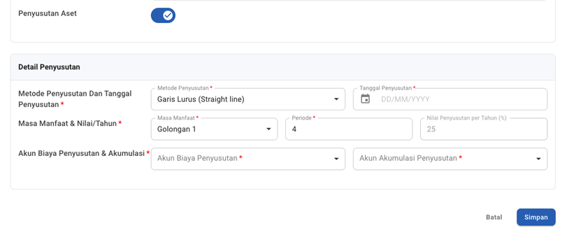 - Jika aset mengalami penyusutan, aktifkan tombol Penyusutan Aset, lalu isi: