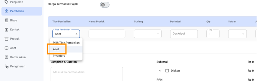 Selain saldo awal, aset juga dapat ditambahkan melalui transaksi pembelian baru.